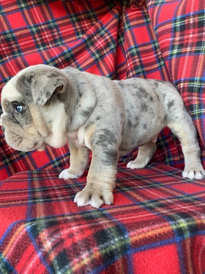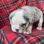 Щенок цветного английского бульдога, мальчик. Окрас бело-лиловый мерль. Документы АВKC. Привит по возрасту. Озорной, чудесный мальчик ищет своих маму и папу.